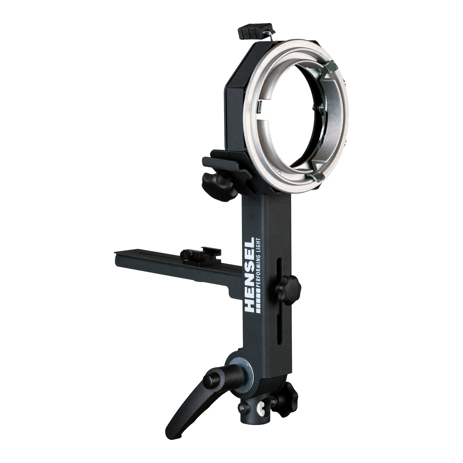 Stativhalterung und Schirmhalter sind integriert, ein Metall-Blitzschuh wird mitgeliefert. Zum Transport klappen Sie die Blitzschiene einfach ein.